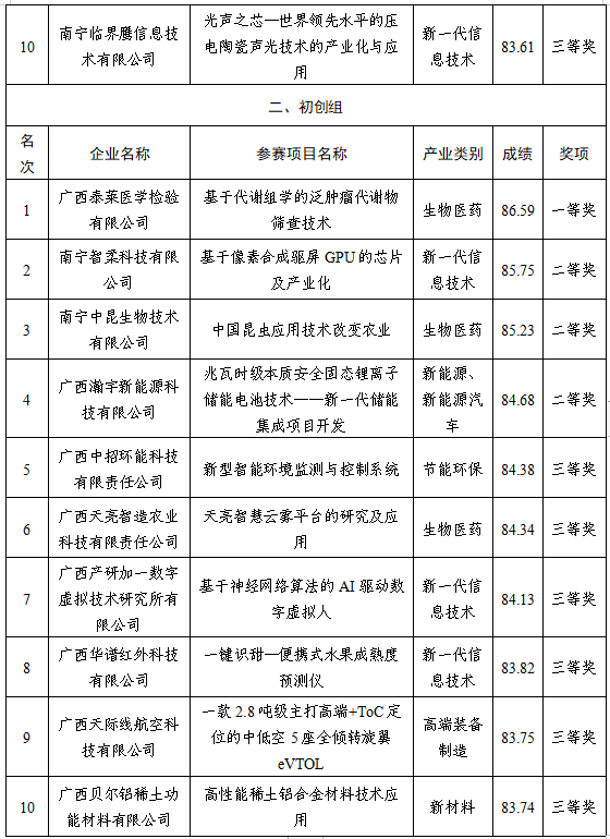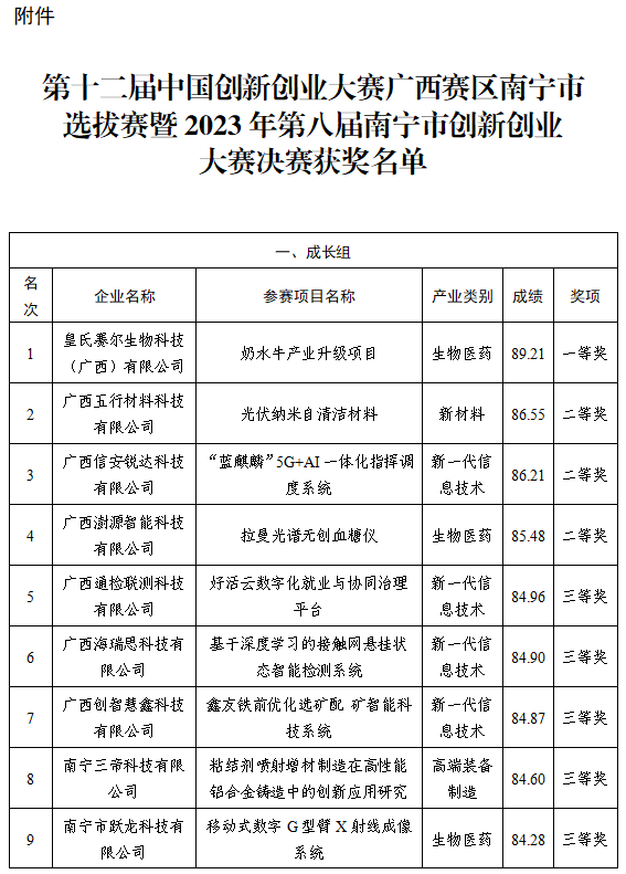 附件:第十二屆中國創(chuàng)新創(chuàng)業(yè)大賽廣西賽區(qū)南寧市選拔賽暨2023年第八屆南寧市創(chuàng)新創(chuàng)業(yè)大賽決賽獲獎名單