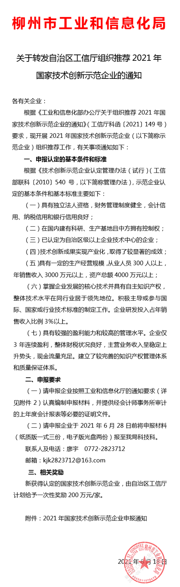 關(guān)于轉(zhuǎn)發(fā)自治區(qū)工信廳組織推薦2021年國家技術(shù)創(chuàng)新示范企業(yè)的通知(2021-06-21)