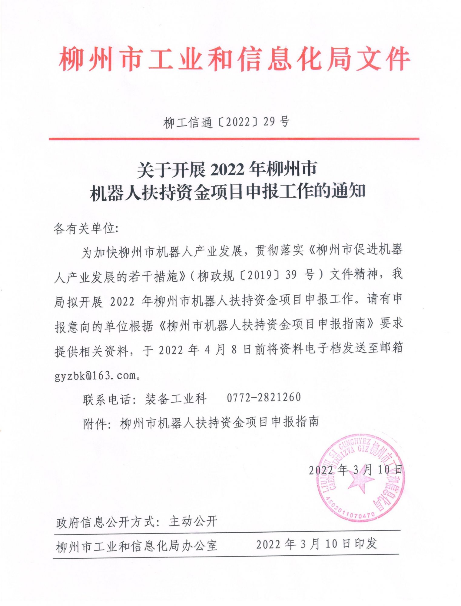 關(guān)于開展2022年柳州市機器人扶持資金項目申報工作的通知